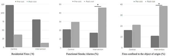 Figure 4. Change in post-intervention fire rates between the control and intervention groups for residential fires, functioning smoke alarms, and fires confined to the object of origin. * Significant increase between pre- and post-visit within group (p-value≤0.05).