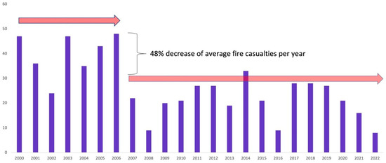 Aligning with the international literature, this study confirms that households with functioning fire alarms reported remarkably low rates of fire-related injuries and deaths [29]. Installing and maintaining functional smoke alarms at residential properties is one of the prominent residential fire prevention strategies and key to sustainably securing fire safety over time [28,30,31]. Moreover, this study shows that targeting high-risk households through an initial assessment and mapping using geographic information systems (GIS) [14,15,30,32] was critical to substantially reducing fire casualties among vulnerable populations. Selected household characteristics tend to increase individuals’ vulnerability to and risk of fires, including households with children aged less than 6 or older adults aged more than 64, single parents, residents who are frequent movers, residents with low income or unemployment status, those residing in older buildings, individuals with disabilities, and immigrants [33,34]. Moreover, tailored and culturally sensitive fire safety interventions were shown to effectively reduce fire-related morbidity and mortality, particularly among populations with unique demographic characteristics [35,36,37,38].