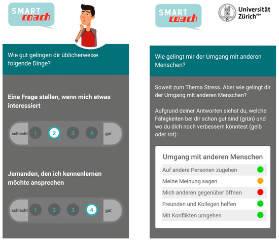 The SmartCoach (www.smartcoach.info, accessed on 12 July 2023) program provided tailored web-based feedback and text messages to promote self-management skills, social skills, and substance use resistance skills over a period of four months. The intervention elements of the program were based on social cognitive theory [22,23] and life skills training [24]. Individually tailored feedback was provided to program participants immediately after they completed the online baseline assessment within their school classroom. It comprised textual and graphic feedback on general stress, degrees of stress in different domains, personally employed and proposed strategies for coping, and levels of social skills tailored to the individual. Screenshots of the baseline assessment and the web-based feedback are shown in Figure 1.