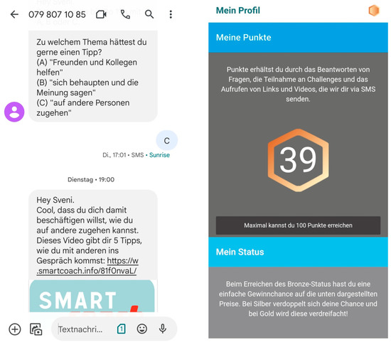 During the four-month coaching phase, participants received a total of 37 text message prompts that invited interaction like replying to quizzes, retrieving media objects, and participating in challenges or contests. To stimulate program engagement, a friendly competition amongst participants was integrated into the program. Within the friendly competition, program participants could collect credits for each interaction, such as participating in quizzes, creating messages or pictures within contests, or accessing video links integrated in text messages. The more credits participants accumulated, the better their chances were of winning one of several prizes that were part of a prize draw (10 prizes totaling CHF 500) after the program’s completion. Participants could access their credit total at any time from their own profile page and compare it to the total of other program participants. Sample screenshots of the program from the coaching phase are shown in Figure 2.