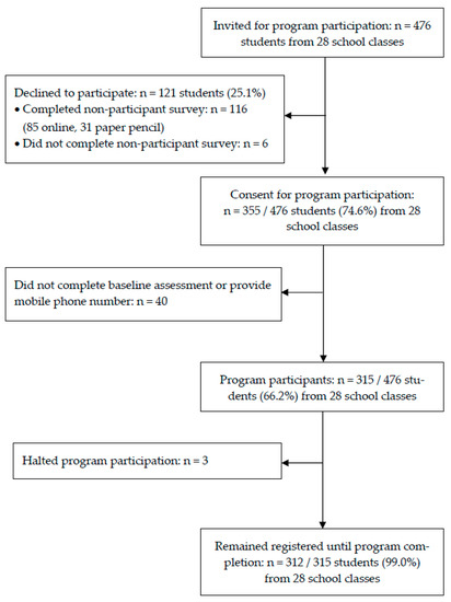 For this study, we defined program participants as students present in the classroom who (1) completed the survey on their smartphone, (2) gave informed consent to participate in the program, and (3) provided the necessary baseline data on stress, social skills, and their mobile phone number to receive the coaching. Non-participants were students who (1) did not participate in either the smartphone survey or the paper–pencil survey, (2) participated in the non-participant paper–pencil survey, (3) participated in the smartphone survey but did not give informed consent to participate in the program, or (4) participated in the smartphone survey and initially provided informed consent to participate but then did not provide the baseline data necessary for program participation.