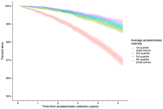 Kaplan-Meier survival curves and 95% confidence regions (shaded areas) by physical activity volume (average accelerometer intensity) quartiles: note y-axis does not start from zero. Kaplan-Meier log-rank test, p < 0.001.