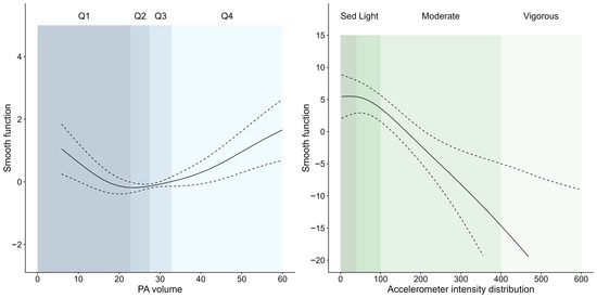 PA is a multidimensional behavior comprising not only intensity but also overall energy expenditure, duration, frequency and type of activity [13]. Different dimensions may be associated with different aspects of health. For example, the importance of PA volume versus intensity appears to differ for different outcomes and biomarkers [14,15,16]. Considering multiple dimensions of PA is a relatively new but promising area of research that takes advantage of the rich time series data produced by accelerometers. A new metric, the intensity gradient [17], avoids collinearity and so can be used alongside PA volume and was found to be independently associated with health outcomes in adults [17,18] and children [18,19]. Alternatively, compositional multiple linear regression avoids the problem of perfect multicollinearity of 24-h time budget data but relies on cut-points for sedentary, light, moderate, and vigorous activity [20]. Another option is to work with the intensity distribution in the form of a histogram, but this can be problematic due to the high collinearity of neighboring intensity bins. One approach [21] uses multivariate pattern analysis to deal with collinearity and has found that vigorous intensity activity was most strongly related to metabolic health in children. However, it uses proprietary software and cannot easily be extended for confounders. An alternative approach [22] uses a penalized spline to smooth the association across the histogram bins. They found a nonconstant, nonlinear relationship between fat mass and PA in adolescents, with lower fat mass associated with frequencies in the higher intensity bins. In neither case is it clear whether observed associations are due to more intensive, or higher overall PA volume.