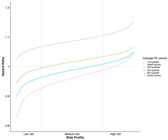 Hazard ratios by physical activity volume and risk profile. PA = physical activity. Hazard ratios are compared to a participant with an average PA volume and a medium-risk profile.