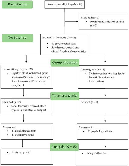 Participants were recruited between December 2021 and April 2022 among those who had voluntarily chosen to participate. Forty-four women were assessed for eligibility and two were excluded, so forty-two women comprised the initial sample. Of these, n = 28 BC survivors completed the Somatic Experiencing® intervention (8 weeks between April and June 2022), but n = 7 participants were removed from the analyzed sample because they simultaneously started another activity aimed at psychophysical support. Therefore, the total sample was composed of 35 participants: n = 21 comprised the intervention group, while the remaining n = 14 comprised the control group (women on the waiting list for Somatic Experiencing® intervention). Figure 1 shows the research process.