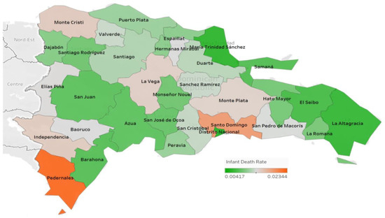 Figure 1 and Figure 2 represent the proportions of the infant death rate and maternal mortality rate by province, respectively, in the Dominican Republic across all 31 provinces and the National District (Distrito Nacional). The infant death rate was lowest in El Seibo at 6.4 × 10−5 and highest in Elías Piña at 5.4 × 10−4. The maternal mortality rate was lowest in Hermanas Mirabal at 4.35 × 10−5 and highest in Independencia at 2.04 × 10−4.