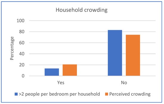 Most households were classified as not crowded; however. more households were perceived as such, with a fifth of households answering that their household felt crowded. While the Canadian National Occupancy Standard is frequently used to calculate crowding, it can be argued that this is not an appropriate measurement for Aboriginal and Torres Strait Islander communities; a new method that considers social and cultural factors is warranted []. To combat this, we also asked participants about perceived crowding to avoid relying solely on the crowding calculation. Evidence has shown that crowded households are a common concern for Aboriginal and Torres Strait Islander communities, contributing to poor health outcomes; therefore, the collection of this data is useful for assessing public health risks within communities [,].
