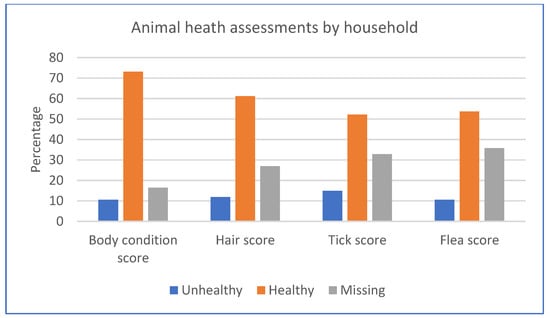 Out of the 81.7% of households that owned cats and dogs, 73.1% of households had animals with ideal body condition scores (BCS of 4–6), 61.2% had animals with healthy hair scores (hair score of 1), and 52.2% and 53.7%, respectively, had animals with no ticks and fleas (tick and flea score of 1) (Supplementary Table S4). For each measure, less than 15% of households were assessed as having animals with unhealthy outcomes; however, these measures had many missing data (Figure 4).