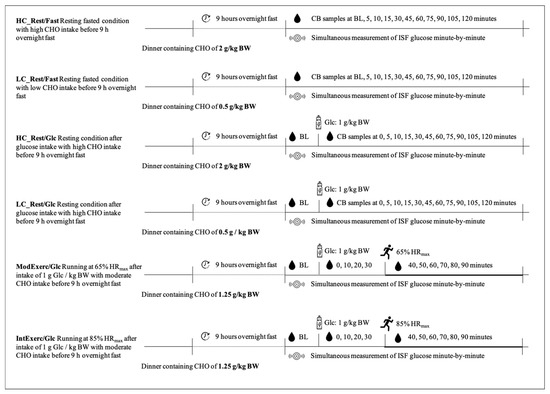 Fasted test protocol for resting conditions after high carbohydrate (CHO) dinner (HC_Rest/Fast) or a low CHO dinner (LC_Rest/Fast). Postprandial test protocol for resting conditions after a high CHO dinner (HC_Rest/Glc) or a low CHO dinner (LC_Rest/Glc). Postprandial test protocol for running at 65% HRmax or 85% HRmax after a moderate CHO dinner (ModExerc/Glc, IntExerc/Glc). BLOOD SPOT = CB sample collection, SENSOR = time of consideration of sensor-generated data, BOTTLE = ingestion of glucose solution containing 1 g Glc/kg BW, RUNNING PERSON = Start of activity.