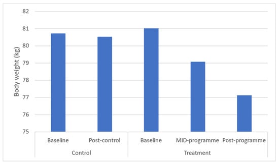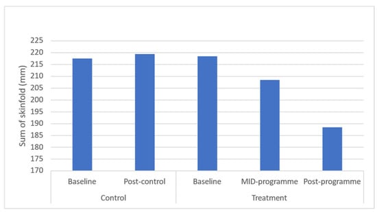 Results demonstrated significant (p ≤ 0.05) improvements in body weight (p = 0.043), BMI (p = 0.037), and waist (p = 0.031) and hip circumferences (p = 0.040) across the entire programme (Figure 1, Figure 2, Figure 3, Figure 4 and Figure 5). However, no significant change was found in sum of skinfolds following the programme (p = 0.057), despite a medium effect size being found (Figure 6). For body composition, moderate effect sizes were found for all the remaining body composition variables at completion of the programme. When evaluating the time-course changes in body composition, BMI was found to initially remain stable at mid-intervention followed by a decrease. Hip circumference was found to decrease by mid-programme but plateaued for the remainder of the programme.