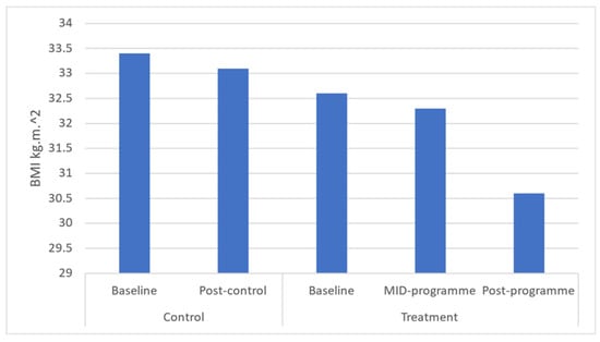 Effects of a community-based mind–body (Tae-Bo) physical exercise programme on body mass index (BMI) in rural black overweight and obese women with manifest risk factors for multimorbidity. Legend: BMI: body mass index; kg·m−2: kilograms per square metre.