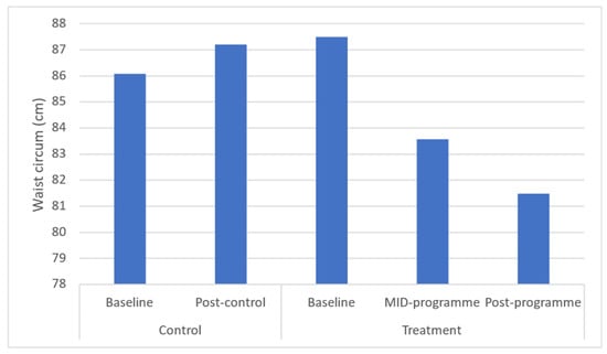 Effects of a community-based mind–body (Tae-Bo) physical exercise programme on waist circumference in rural black overweight and obese women with manifest risk factors for multimorbidity. Legend: waist circum: waist circumference; cm: centimetres.