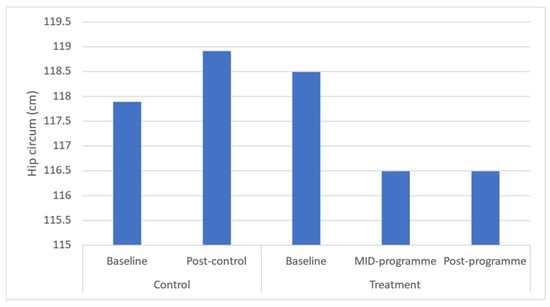 Effects of a community-based mind–body (Tae-Bo) physical exercise programme on hip circumference in rural black overweight and obese women with manifest risk factors for multimorbidity. Legend: hip circum: hip circumference; cm: centimetres.