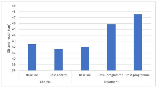This programme significantly improved sit-and-reach flexibility which is similar to that following a 12-week, twice-weekly community-based physical activity intervention using concurrent resistance training and high-intensity interval training (HIIT) in low-income older women (aged > 65 years) []. That programme resulted in an average increase of ~15.8% compared to this study’s 5.6% increase. Possible explanations for that enhanced increase in sit-and-reach performance could be related to the age of the sample utilised and the high intensity of that programme when compared to the present study. Further, following a 6-month, thrice-weekly, 90 min multimodal (aerobic, strength, balance, and flexibility training) programme, middle-aged participants (51 years) observed a median 1.74 cm increase in sit-and-reach performance []. It is worth noting that the improvements in this programme arose despite the mean values found in this programme at baseline being above those considered excellent (≥29 cm) for this sample aged 25 ± 5 years []. Adequate range of motion is clinically important, especially in overweight or obese individuals, to reduce their risk of injuries and falls, improve muscle blood flow, enable muscles to work most effectively, and improve their ability to do daily activities [].