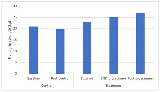 This 10-week programme resulted in an approximate 4 kg increase in hand grip strength from 22.9 to 27.0 kg in this sample of rural black overweight or obese women with manifest risk factors. This increase is supported, albeit on a smaller scale, by a previous study utilising a 12-week, twice-weekly community-based physical activity intervention using concurrent resistance training and high-intensity interval training (HIIT) in low-income older women (aged >65 years) []. In that study, researchers found an average increase in hand grip of 15.8%. These increases in hand grip strength are important since hand grip strength is often used as an indicator of overall muscle strength and low hand grip strength is linked to a variety of poor health outcomes, including functional disabilities, chronic morbidities, and all-cause mortality []. It is for this reason that many public health initiatives and programmes target the preservation of muscle strength []. It must be noted that the mean values observed in this study are considered low at baseline and at post-programme (ACSM), indicating that further manipulation of programme design variables (i.e., volume, frequency, intensity, type, and/or duration) may be required to optimise hand grip strength improvements.