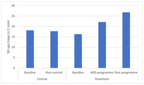 Hand grip strength was found to be significantly increased at both mid- (p = 0.034), and post-programme (p = 0.029), with a large effect being found for this health-related physical fitness parameter (Figure 9). Time-course changes reveal that these increases occurred across the entire programme. Further, sit-up performance was found to be increased at both mid- and post-programme (p = 0.021 and p = 0.018, respectively). Time-course changes showed that these increases occurred across the entire programme.