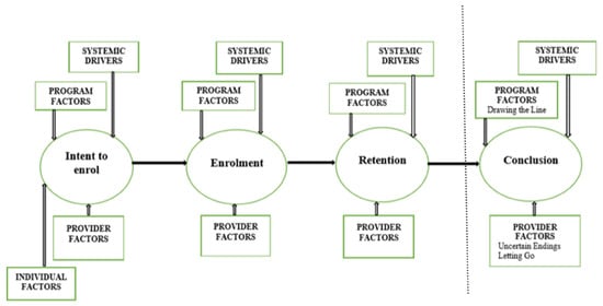The focus of this paper is engagement, moreover the retention of families where nurses have identified risk of family violence. Results are presented based on applying the Framework of Practice for working with families with multiple and complex needs [25]—(see Figure 1). The framework depicts the additional factors related to individuals, programs and systems which framed the broader study from which this paper is based. This paper specifically takes the perspective of the provider with results presented across the enrolment, retention and conclusion phases. The framework argues the critical phases of the relationship between nurse and family exist initially at enrolment—where families are engaged, followed by retention—where families continue to access care and finally, in the conclusion phase—which can occur either with or without warning. This framework is an extension of the Integrated Theory of Parent Involvement [24] arguing for a final stage of parental involvement that occurs during the conclusion phase. The vertical line in Figure 1 shows how the extended model aligns with the McCurdy and Daro model. Results are presented according to phase one and phase two of this study.
