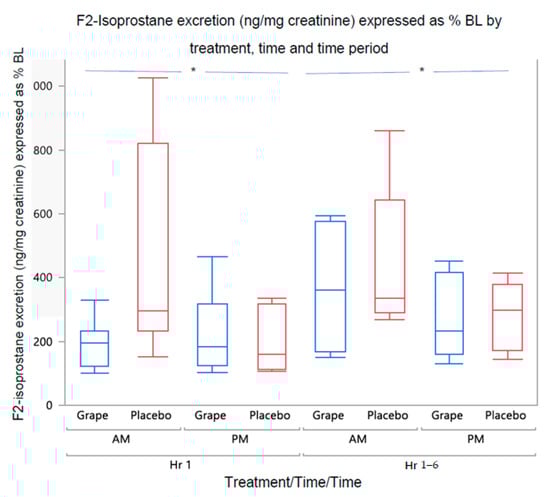 Expressed as % of baseline, F2-isoprostane levels were higher in the a.m. vs. p.m. (p = 0.0003) and at hours 1–6 vs. hour 0–1 (p = 0.04) (Figure 2). A main effect was observed for treatment (grape < placebo, p = 0.04) when sex was excluded as a covariate in the analysis.