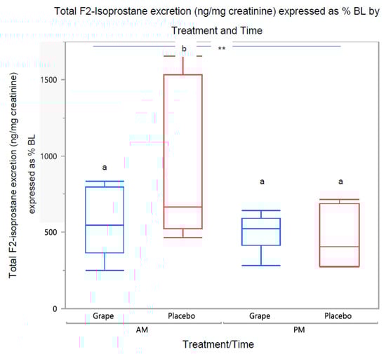 Total post-meal F2-isoprostane excretion as % of baseline. Time effect: a.m. > p.m., ** p = 0.0005; bars not sharing the same letter are significantly different (p < 0.05).