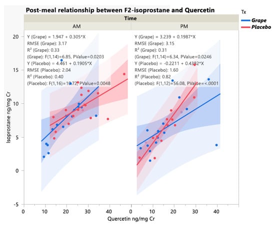 In this study, we measured urine grape metabolites to assess the absorption of the grape’s antioxidant and anti-inflammatory components and identify possible correlations with the oxidative stress response. Contrary to our expectations, higher metabolite excretion was not related to lower F2-isoprostane levels in regression models. The current finding of a positive relationship between urine F2-isoprostane and quercetin concentrations has been reported previously []. The importance of the stronger relationship between F2-isoprostanes and quercetin in the placebo p.m. compared to other groups in the current study (Figure 3) is unclear.