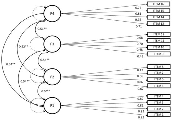 CFA, path diagram of Model 2. Note: F1—attention impulsiveness F2—online vigilance; F3—multitasking; F4—emotion regulation (all paths are significant, p < 0.01 **).