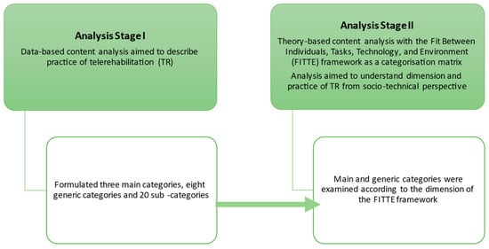 In the second stage, we used theory-based content analysis [,]. In order to describe how TR is put into practice from a socio-technical perspective, we used the FITTE framework [] as a categorisation matrix. With the deductive analysis, we placed the main and generic categories that were formulated in the first stage of the analysis into the socio-technical theory context. We organised the main and generic categories into the FITTE framework dimension of environment and fits between task and technology, individual and task, and individual and technology. The conclusions formed as a result of the first stage of the analysis were conceptualised in relation to the FITTE framework.