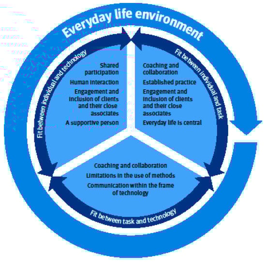 Based on our main findings, TR can be described as technology-mediated home-based rehabilitation. TR can integrate rehabilitation into the client’s everyday life, and it creates a new kind of shared partnership, where the focus of therapy is on coaching and collaboration. TR can provide desired rehabilitation outcomes for clients when it is based on the clients’ everyday life. Our findings, interpreted based on the FITTE framework, demonstrated environmental issues in TR by reaching into the clients’ everyday environment. Therefore, it is important to identify the characteristics of the everyday environment that may affect the ideal fit of relevant technologies.