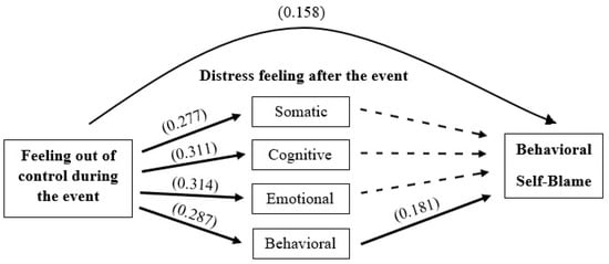 Table 2 shows the correlations between behavioral self-blame, PTSSs, feeling out of control during the traumatic event, and distress following the traumatic event. Notably, all the correlations were positively significant.