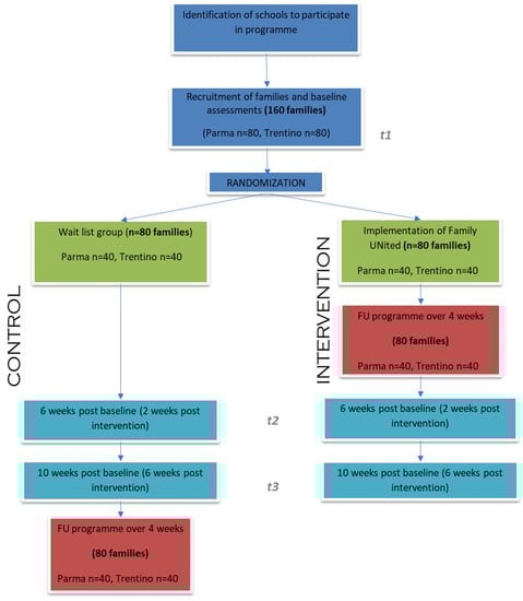 Participants allocated to the waitlist/control group will only receive the questionnaires at the same time as the families in the intervention group. They will not receive any family skills intervention, nor will any contact be made with facilitators before all data have been collected. Only then the waitlist/control families will start the Family UNited training programme, as shown in Figure 2.