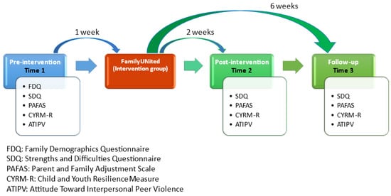 All participating caregivers and children will complete a battery of measures at three points; one week pre-intervention (t1), two weeks post-intervention (t2), and six weeks post-intervention (t3), either electronically through Google Forms or conventionally through paper-based forms, as shown in Figure 3. At baseline, the Family Demographics Questionnaire (FDQ) will provide information on the age and gender of the caregivers, their marital, educational and work status, and the number of children they care for under the age of 16 years. In addition, caregivers will provide information on the age and gender of their children and their relationship to them. They will further provide information on their country of origin (if not Italy) and how long they have been living in Italy.