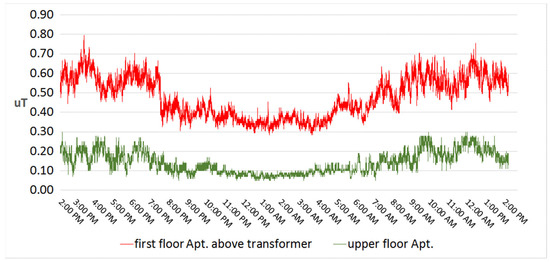 Magnetic field 24 h dosimetry (with time of the day (h) on the x-axis and magnetic flux density (µT) on the y-axis) with EmdexLite data logger on the first floor above an inbuilt transformer station and on the upper floor in same building. (Figure modified from [9]). The measurement results show clear differences between the magnetic field values measured in the floor directly above (in red) the transformer room and on other floors (in green).