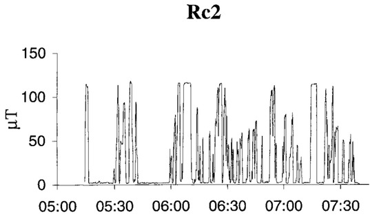Magnetic field recordings when the driver on an RC2 freight train engine kept a logger (EmdexLite) in the breast pocket of their jacket. The diagram shows that the logger was sometimes saturated, giving the maximal reading of 120 µT. The curve also illustrates the intermittent character of the exposure. Time of measurement is depicted on the x-axis, with magnetic flux density (µT) on the y-axis (Hansson Mild, personal communication).