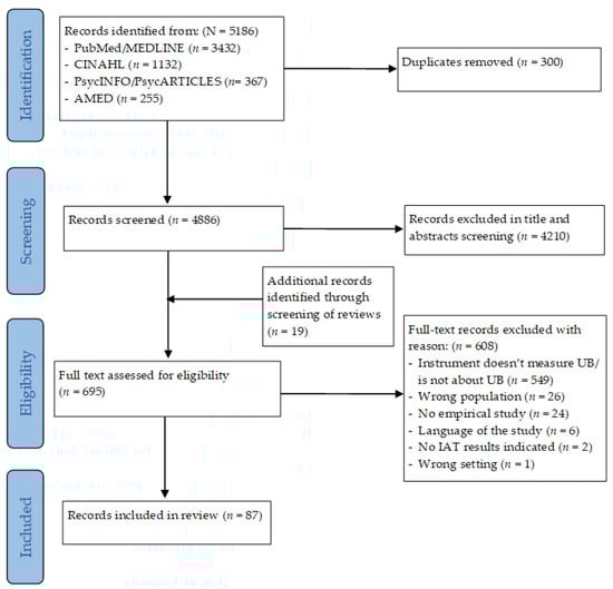 The database search resulted in 5186 records (see Figure 1). After the removal of 300 duplicates, 4210 records were removed during the title and abstract screening, resulting in 676 records. From the reviews, 19 additional studies were extracted at this point of the review process, leading to 695 records. Of these 695 records, 608 records were excluded for the following reasons: 549 studies predominantly used self-report questionnaires with explicit measures, 26 records addressed the wrong population, measuring patients’ bias either in students of health professions or untrained health professionals, 24 records were excluded as they were not empirical studies, 6 records were written in another language than English, French or German, 2 studies used an implicit measure (IAT) but did not publish the results, and 1 study was conducted in a community setting. As a result, 87 articles that were based on 81 studies were included. For six studies, more than one article was published reporting different aspects but using the same data.