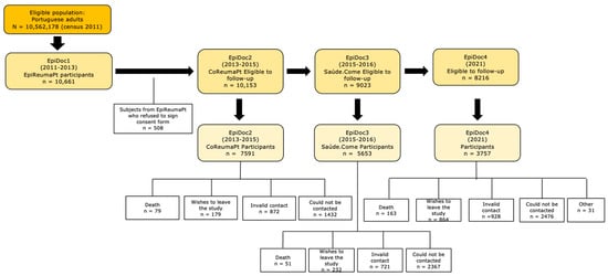 - Rodrigues, A.M.; Gouveia, N.; da Costa, L.P.; Eusébio, M.; Ramiro, S.; Machado, P.; Mourão, A.F.; Silva, I.; Laires, P.; Sepriano, A.; et al. EpiReumaPt- the study of rheumatic and musculoskeletal diseases in Portugal: A detailed view of the methodology. Acta Reumatol. Port. 2015, 40, 110–124. [Google Scholar]