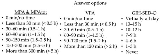 A total of two questionnaires on PA (BHW-Q, Haskell-Q) and one on SED (GIH-SED-Q) were included in this study. Two supplementary adapted PA questions were added to this study, relating to the Haskell-Q (MPAtot) and BHW-Q (MPAtot) without 10 min bouts. This was due to the recently updated guidelines for PA where recommendation for bouts of 10 min or more has been omitted [2,4].