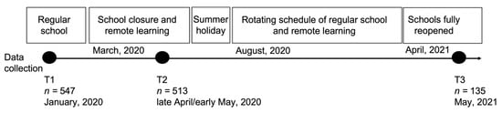 The participants were recruited to the study by request from a public high school in central Sweden as part of a school-run mental health initiative that included a lecture on lifestyle and digital media habits and mental health for the entire school. All students at the school (approximately 650) were invited to participate in the study. After providing informed written consent, the students received a digital link where they were asked to complete an anonymous survey in class, pre-pandemic in January 2020 (T1 = pre-COVID-19; see Figure 1 for a timeline). No support was required by the researchers or teachers during the data collection. This resulted in a total of 547 students (68.2% females, age range 15–19, M = 16.93, SD = 0.83, 8.6% with an immigrant background) who completed the survey at baseline. The school then switched to remote learning when all high schools in Sweden closed in the middle of March 2020, and we therefore contacted the school again as we saw an opportunity to investigate the effects of the COVID-19 pandemic restrictions. In a second wave, data were collected in late April/early May 2020 (T2 = 1–2 months into pandemic restrictions), resulting in 513 students (68.6% females) who were manually matched to responses collected at T1 using birthdate and sex. The remote learning continued during the Autumn term until mid-November. The schools then gradually increased regular classroom sessions on a rotating schedule, resulting in, on average, one or two days at school per week for the students. Due to a surge in the spread of the virus, the schools were forced again to conduct remote learning for two weeks during January, after which the rotating schedule was used until the schools re-opened full-time in April 2021. In the final wave, data were collected in May 2021 (T3 = 14 months after the beginning of restrictions), with 166 respondents. Only students who completed at least two assessments were included in the analysis. At T3, this resulted in 135 matched (to T1 or T2) students, bringing the final sample included in the mixed model analysis to T1: 547; T2: 513; and T3: 135. The relatively low response rate for T3 was mainly a result of the fact that the seniors from previous waves had graduated, and because we did not have their contact information, we could not reach them at T3. The proportion of students with an immigrant background was similar across all time points (ranging between 8.6 and 9.6%). The sample at T2 did not differ significantly from the sample at T1 regarding sex or age. However, the proportion of females participating at T3 was significantly lower (56.3% females) than among T1 and T2 only responders (71.9 and 71.1%), χ2 > 6.5, p < 0.02). The sample responding at T3 did not differ on any of the other outcomes at T1 compared to non-responders at T3 (t values between −0.17 and 1.23, all ps > 0.19). The study was carried out in accordance with the Code of Ethics of the World Medical Association (Declaration of Helsinki) for experiments involving humans.
