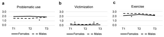 Parameter estimates for the significant interaction terms between sex and time from the mixed models reported in Table 1. (a) problematic use of digital media; (b) victimization; (c) exercise. * = indicates for what time point (i.e., T1 vs. T2 or T2 vs. T3) that the interaction effect is significant.
