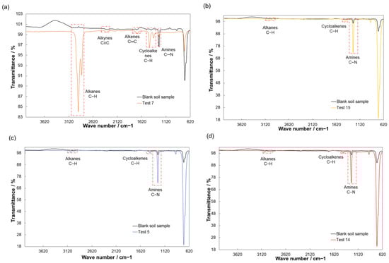 FTIR analysis of automotive residual oil-contaminated soil and its comparison with uncontaminated soil. (a) Biostimulation with Ricinus communis L. enzymes at ambient conditions for 49 days (test 7), (b) biostimulation with Ricinus communis L. enzymes and vermicompost at ambient conditions for 49 days (test 15), (c) biostimulation with Ricinus communis L. enzymes at ideal conditions for 49 days (test 5), (d) biostimulation with Ricinus communis L. enzymes and vermicompost at ideal conditions for 49 days (test 14).