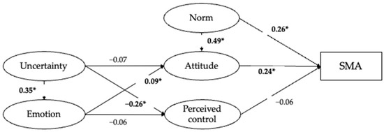 Among the TPB variables, the subjective norm of performing SMA for children was significantly associated with parents’ attitude towards SMA for children (β = 0.49, p < 0.001), which suggests that parents who perceive stronger social pressure to practice SMA for their children tend to have a more positive attitude towards SMA for children.