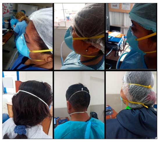It is important to mention that during the evaluation we noticed that the nose clip of most of the Makrite and Xiantao Zhong Yi ZYB-11 FFRs did not adapt correctly to the shape of the nose of the HCWs. Despite the attempts to adjust the FFRs during the training, noticeable openings formed in the nasal area that would explain why we obtained very low levels of rt-FF and overall-FF. Some HCWs reported that the nose clip of Makrite FFR, initially in the form of an arch, has limited malleability and yields to its original shape after adjustment. We also observed a loss of fit in the chin region, partly evidenced by the excess length of the elastic bands. Given this, some HCWs reported that the elastic bands tend to remain stretched due to the loss of their elasticity, and therefore, they must tie them to increase the fit (Figure 2).