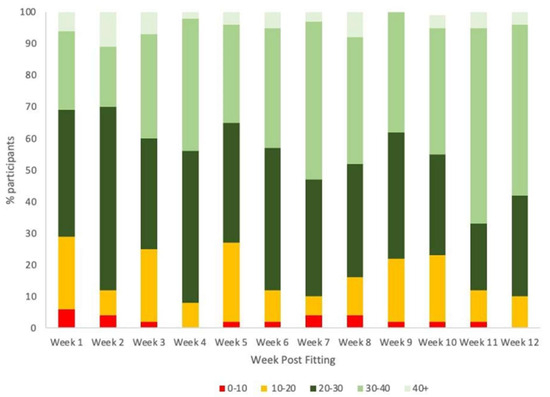 Fifty-three children with GJH participated in this study with one participant lost prior to the 1 month follow-up due to personal reasons. Most participants were recruited from the Narrabeen Sports Medicine Centre (n = 43), with the remainder referred from the Children’s Hospital at Westmead and local allied health practitioners. The demographics and baseline characteristics of participants are summarized in Table 1. Weekly self-reported wear time of the orthotics indicates that participants gradually increased wear time over the trial period, with the majority of participants wearing the orthotics > 20 h per week from week 1, and >30 h/week by week 11 (Figure 1). Significant differences in wear time were demonstrated between week 1 and week 12 (p < 0.001) as well as week 2 and week 11 (p = 0.027).
