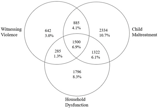 Venn diagram depicting the number of participants experiencing each ACE category. Total available sample (N = 21,716), No ACEs = 12,952 (59.6%).