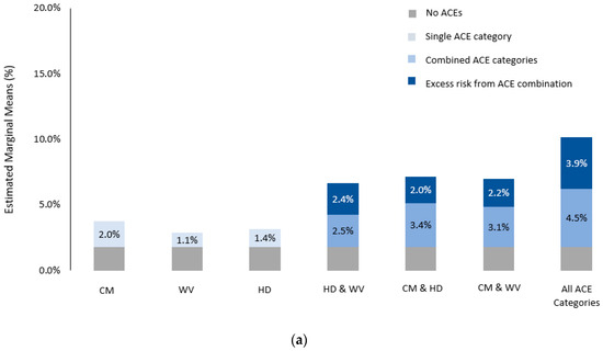 (a) Additive effects of ACE categories in isolation and combination—victim of violence; (b) additive effects of ACE categories in isolation and combination—perpetrator of violence. Note: CM = child maltreatment, WV = witnessed violence, HD = household dysfunction.