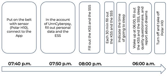 The participants connected the Polar H10 sensor to the Polar Sensor Logger App at 07:40 p.m. Then, they filled out personal information and some questionnaires. At 08:00 p.m., and each 30 min further, they filled out cyclic tests (the KSS and the SSS) until the time they went to bed. Participants of the study were instructed that after the start of the experiment, they should remain at home, carry out their regular household duties, and refrain from engaging in any physical exercises.