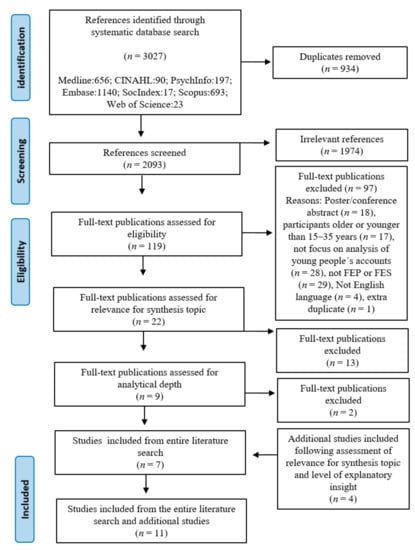 Prior to the synthesis, a systematic literature search was conducted in March 2021. Assisted by an information specialist [], the first author conducted a search involving a building block strategy [] in seven databases between January and March 2021 (Figure 1). The search combined five search blocks. Four blocks, ‘youth’, ‘psychosis’, ‘recovery’ and identity’, were defined with reference to the aim and research question of the study, while the fifth block limited the search to qualitative studies. We identified search terms in the thesauruses of each database and free-text words through an examination of keywords of relevant publications. Free-text words were applied across databases. Given the study’s specific interest in young people, we exclusively searched for youth and free-text synonyms of this term in the title field. As young people’s experiences of recovery are an eligible subject of research within a range of disciplinary fields, the search was conducted in seven databases, including Medline, CINAHL, PsychInfo, Embase, SocIndex, Scopus, and Web of Science. Due to the broad perceptions of recovery and identity as both personal and social processes, various synonyms were used (Table S1 illustrates the search string from Embase in the Supplementary File). The systematic literature search identified 3027 publications. Duplicates were removed, leaving 2093 references to be title-screened by the first and second author. The abstracts of the remaining 119 studies were evaluated against inclusion and exclusion criteria.