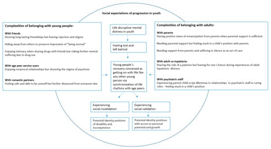 This meta-ethnography synthesizes young people’s recovery and identity processes, as captured in empirical qualitative studies of young people’s experiences of life-disruptive mental distress and interpreted via a theoretical lens of young people’s belonging work. The study contributes with a social explanation [] of how young people struggle with expectations of progression in youth, while facing stagnation and a loss of connectedness to age peers in times of life-disruptive mental distress. The struggle involves young people’s need to navigate the complexities of belonging with others, particularly their desire and effort to belong with other young people to achieve recognition in the position of a young adult. We interpret that young adults perceive recovery as the process of getting on with life like any other young person. Interactions with and validation from friends are key to this process, as this enables young people to form a positive self-image which is a vital element of recovery. Experiences of invalidation and socializing primarily with caring adults may keep young people stuck in the role of a child. Being able to position oneself as an emerging adult with adult civil rights supports young people’s empowerment.