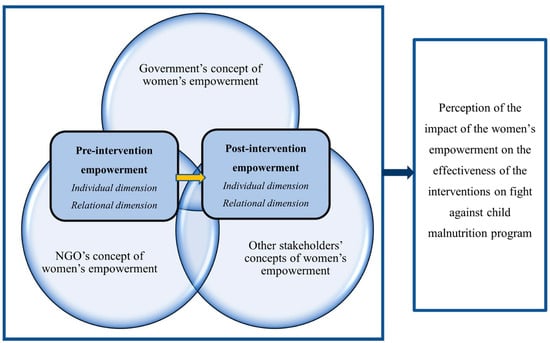 Figure 1 shows the conceptual framework on which the study is based. The three major groups considered are (1) government and party organizations, (2) non-governmental organizations (NGOs), and (3) other organizations as UN Agencies, which interact to implement programs to combat malnutrition. Each has its own conception of empowerment. Their interactions lead to a peculiar concept of empowerment that will be transmitted to the target populations of the interventions, i.e., mothers of children under 5 years old in the community.