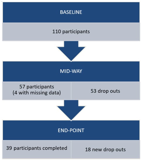 Figure 1 details questionnaire completions and number of drop-outs. At the mid-point, 48.2% of the baseline sample had dropped out of the programme, and a further 16.4% dropped out by the end point, meaning a total drop out of 64.5% from baseline. Of the total runners who dropped out of the intervention, 74.6% of these were before the mid-way point. Twenty-one (29.6%) of the runners who ceased the programme completed a questionnaire booklet at the time of drop-out; unfortunately, reasons were not provided as to why more individuals did not return the questionnaire at this point.