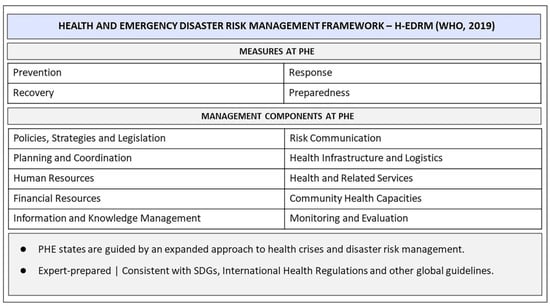 - WHO. Health Emergency and Disaster Risk Management Framework. 2019. Available online: https://apps.who.int/iris/handle/10665/326106 (accessed on 17 June 2022).