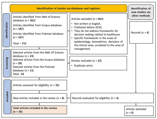 To perform the search for studies related to the research topic, the filters pre-established by the respective databases were prioritized. In the Web of Science, these included Health Care Sciences Services, Medical Informatics, Environmental Sciences, Medicine General Internal, Computer Science, Artificial Intelligence, Emergency Medicine, Multidisciplinary Sciences, Management, Health Policy Services, Nursing, Computer Science Interdisciplinary Applications, Infectious Diseases, Pharmacology Pharmacy, Medicine Research Experimental, Water Resources, Computer Science Information Systems, Environmental Studies, Psychiatry, Social Sciences Interdisciplinary, Operations Research Management Science, Tropical Medicine. In Scopus, these included Social Sciences, Computer Science, Mathematics, Health Professions, Decision Sciences, Business, Management and Accounting, Economics, Econometrics and Finance. For Pubmed, all studies were looked at. After this step of applying the filters, 715 studies were identified.